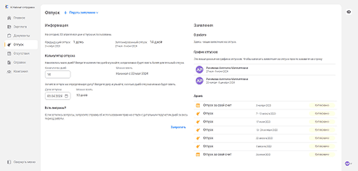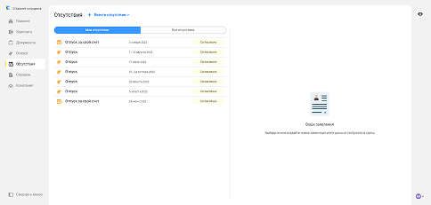 Сотрудники получают доступ к личному кабинету, где могут легко отправлять заявления, запросы и подписывать документы. Личный кабинет доступен через мобильное приложение или веб-браузер на любом устройстве, что делает взаимодействие простым и удобным